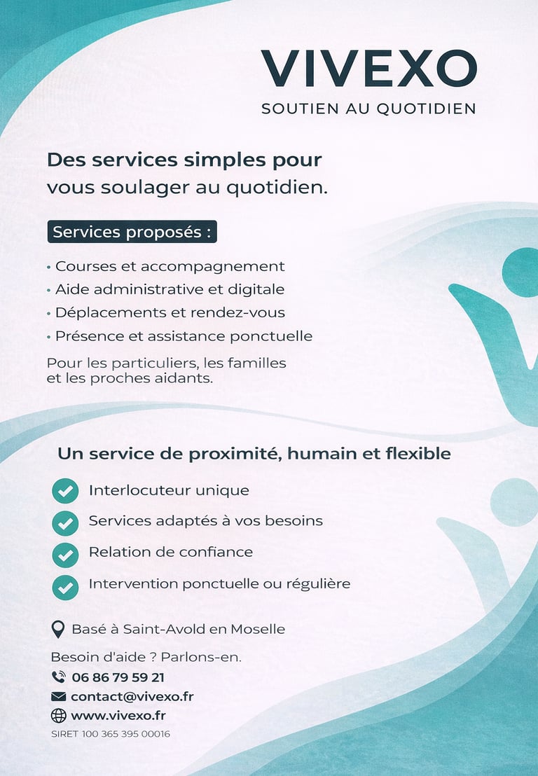 Implanté localement, Vivexo assure un accompagnement de proximité, réactif et humain, au service des seniors et de leurs familles, avec une réelle connaissance du territoire.